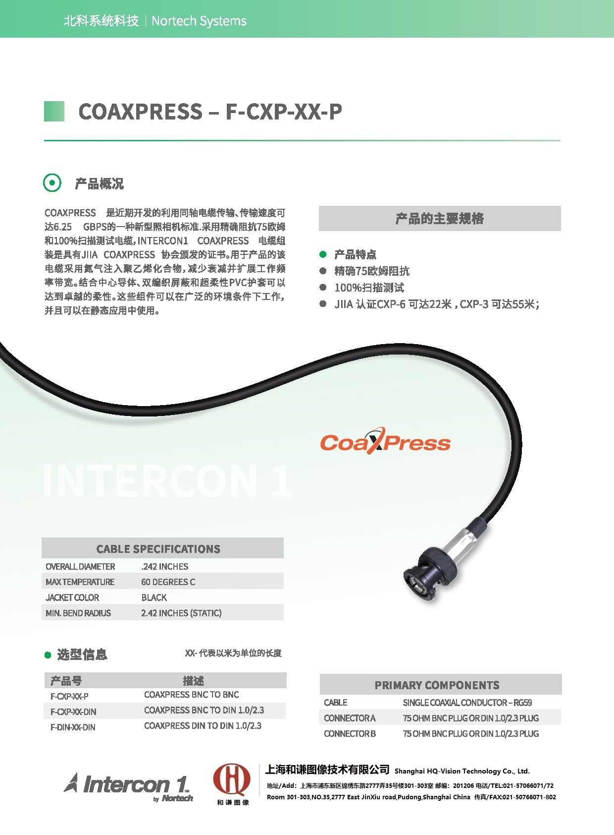 CoaXpress是最近開發(fā)的相機(jī)標(biāo)準(zhǔn),采用單根同軸電纜,傳輸速率高達(dá)6.25 Gbps。Intercon 1 CoaXPress電纜組件采用精密75歐姆阻抗和100%掃描測試電纜,通過JIIA認(rèn)證,符合CoaXPress標(biāo)準(zhǔn)